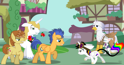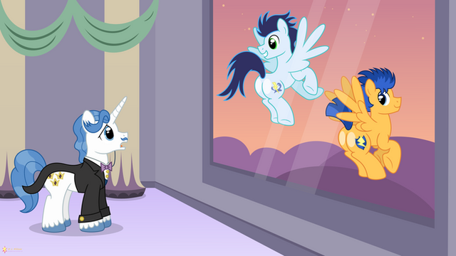 Twilight Sparkle: “Welcome Rainbow Dash and Soarin. Flash and I are so glad you could join us for dinner.”Flash Sentry: “Soarin.”