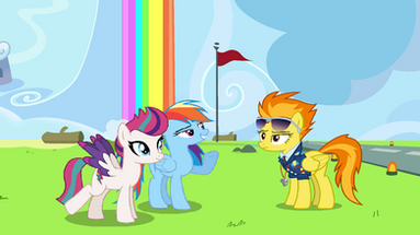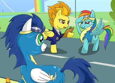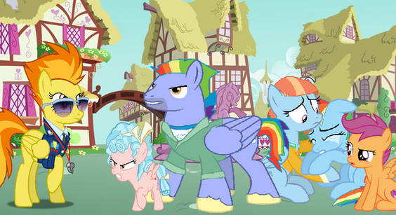 Rainbow Dash: “Come on Soarin, don’t let anypony push you around! Explain to that guard why the Wonderbolts rule!”