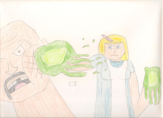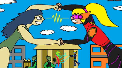 Becky: Very, VERY literally, folks... Now, it appears that Colossal Lass is about to behead the monster with its own massive pincer! But, surly this is some sort of fear tactic, as normally our city's beloved hero would never resort to such a brutal execution even on a mon--!