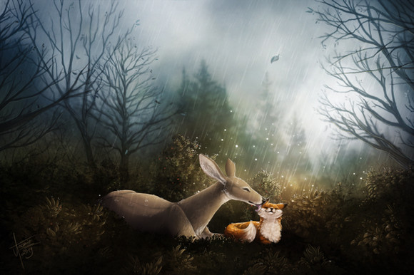 Gorgeous painting, love the warm color setting for a fox and their kit.