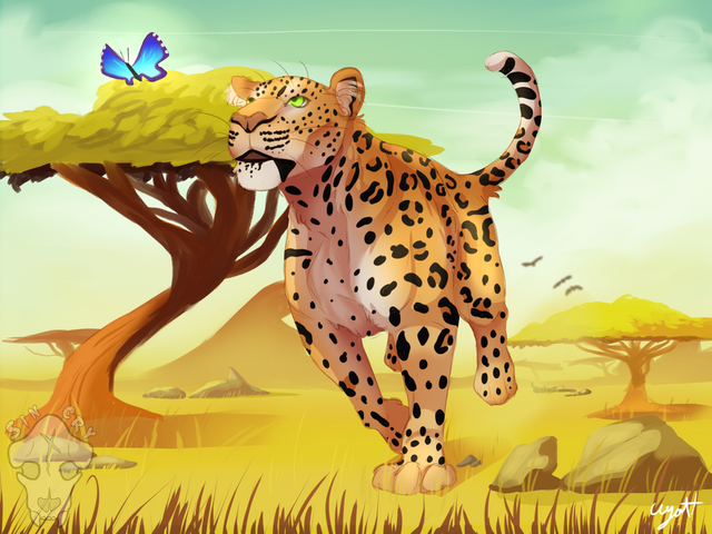Thank you, the picture is very nice. The impression is that you are the victim yourself, just as the leopard sneaks towards you. His fur is in contrast to the blue sky, the clouds against this a certain dynamic. The brown grass of the savannah gives some cover for the leopard, he makes the most of it.