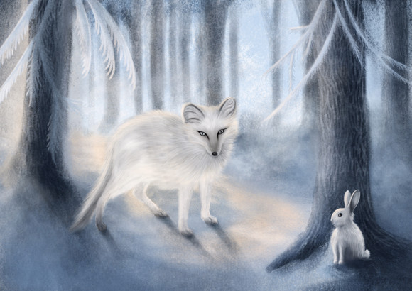 This is really very beautiful. The expression on the wolfs and the rabbits face are sweet and gentle and the soft tones of the snowy and snow coveredΒ background give this piece a magical and dreamy touch. Very well done! Β Β Β