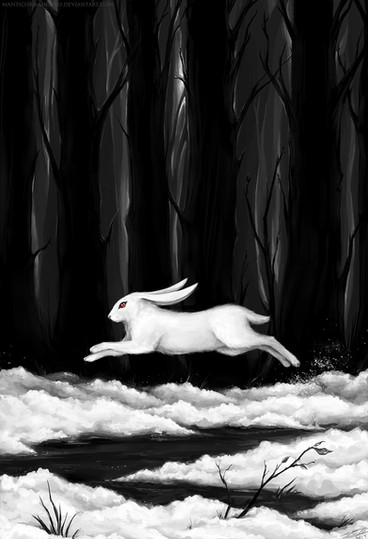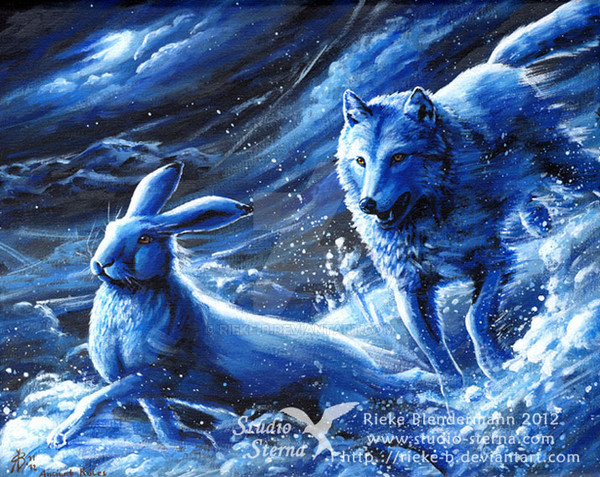 This is beautiful! I love the contrast I the characters, white. And black, hare and wolf. It really is beautiful! Wonderful work!Β