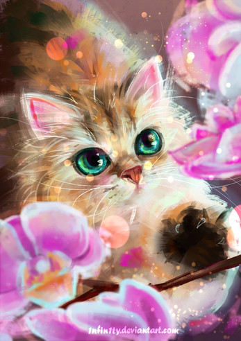 I can just hear the cat purring :3 I like how you get the water effect; it looks realistic. I can see the cat's cuteness and innocence. Very nice touches in reflecting the light and having the flowers.