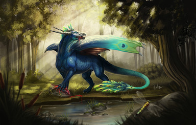 How cool! Its also interesting that its got fur/feathers rather than scales, and I don't think I've seen a hybrid of east and west...Neat concept!