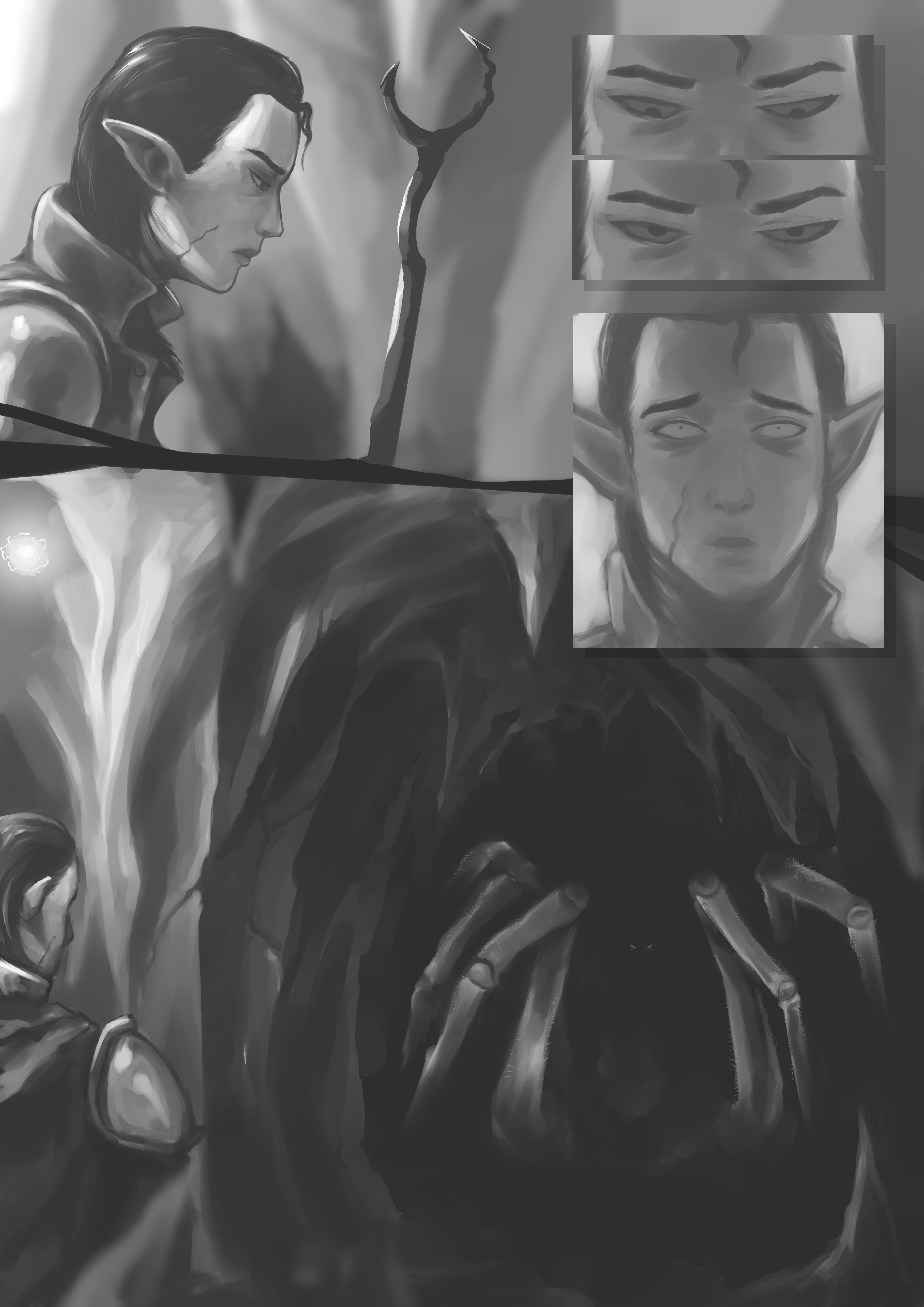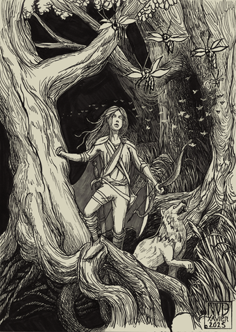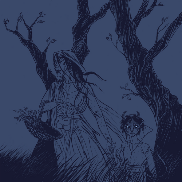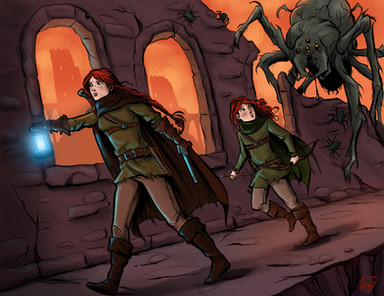 Pathfinders must train at a young age, as their duty to protect the people from the blighted wildlands is held sacred in Othaedal. Young Laumé McGregor and her mother go out on a training hunt. Eleni smiles down upon her wary daughter, "Now that you've seen how to take one on, are you ready to hunt down the nest?"This piece was created in Procreate using an iPad Pro and Apple Pencil. It presents original characters, creatures, and the world of In the Shadow of the Ancients. ItSotA is a comic project that I am working on with my husband, based on a tabletop roleplaying game campaign we ran over the course of years. It was a multifaceted adventure, that spanned multiple groups and branching storylines, and utilized Dungeons & Dragons, Dungeon World, Torchbearer, and Pathfinder.