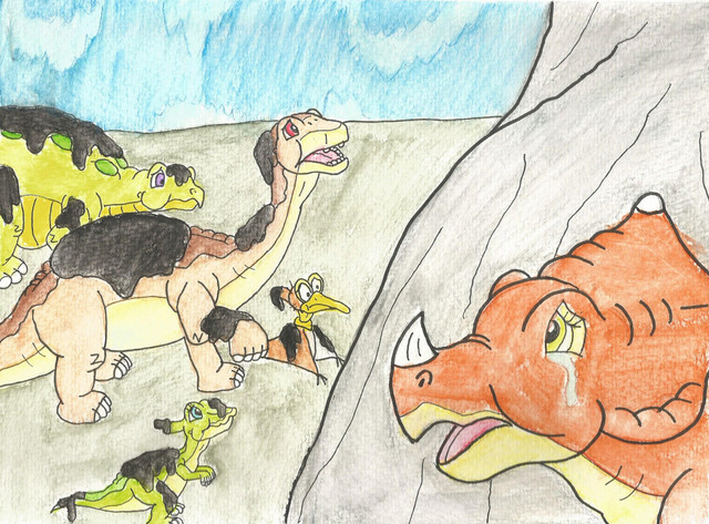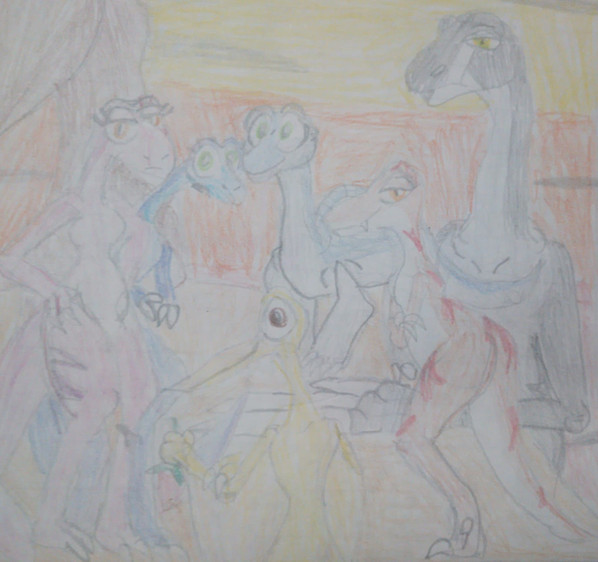 Once I read the fanart prompt I couldn't get the idea of drawing Pterano out of my head and decided on going with a scene in which Pterano is starting to pull desperate members of the herd away with promises of paradise.
