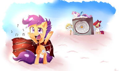 Scootaloo: Come on, slowpokes! Don't you want that hot cocoa?