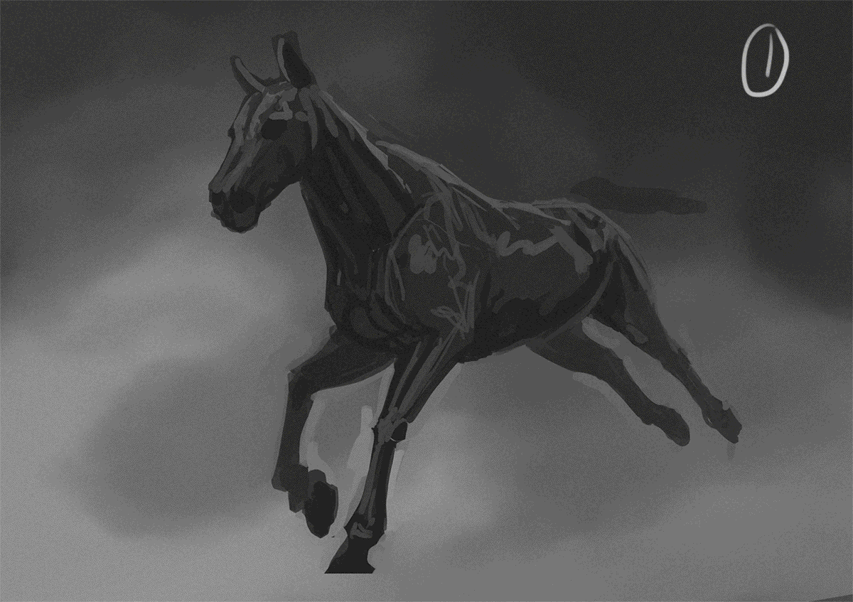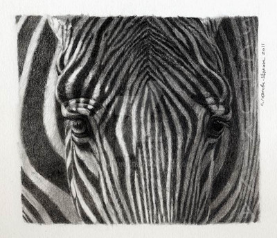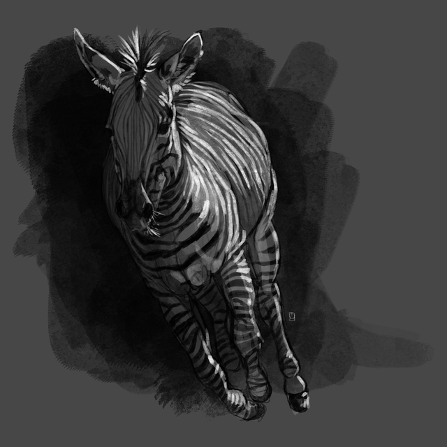 1 - Super rough (wonky!) sketch on a separate layer. I was really not feeling it, haha. Rough outline of stripes, again on another layer. Background is a neutral colour, slightly dark as I want a dark overall composition with the zebra fading into the darkness.
