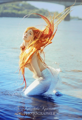 Ultra sultry Ariel just coming out of the water when she realizes she has legs. A little disoriented, distraught, worried, but still making her way to shore. Love the red/white/blue color scheme, dark but soft/