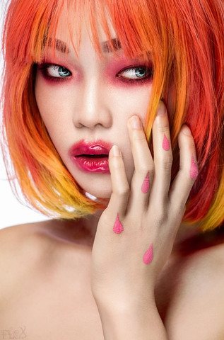 For me, this is a beautiful and impressive image; both the concept and execution are splendid. The sharp edge between the painted areas and the "no make-up" area of her face, the lighting just enough for us to read that her face is framed by her hair, the red on lips and nails and her expression all seem to ask me what is real and what artifice. Of course, the model is very lovely too. Thank you for posting this - I love it.