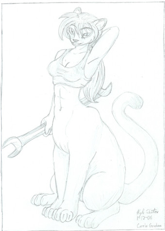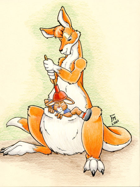 Just a quick picture of Kandace and an unnamed roo character by Jim Groat.Kangaroos have those wonderful pouches, and to have a natural pocket would be a great thing to have handy- er, pawy, but they must be fairly sensitive. You wouldn't want to just drop a screwdriver in there, would you? Luckily pouch protectors are now available in a variety of sizes for every roo girl's protection against sharp pointy things. Get yours today!