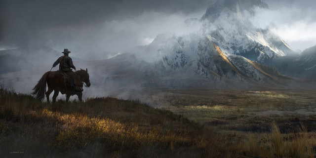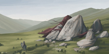 #water #digitalart #digitalpainting #fantasy #grass #horse #illustration #knight #landscape #mountains #rocks #source