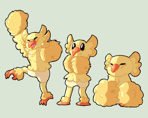 Rowlet is a small, avian Pokémon resembling a young owl with a round body and short legs. Its plumage is primarily beige with a white underside and facial disc. The facial disc itself is in the shape of two overlapping circles. It has large black eyes and a stubby beak. The top part of its beak is white, while the lower half is an orange-brown. Its feet have two forward-facing toes and one backward facing toe; they are the same color as the lower half of its beak. Two leaves sprout from its chest, arranged to resemble a bowtie. Additional leaves form its tail and line the undersides of its wings.