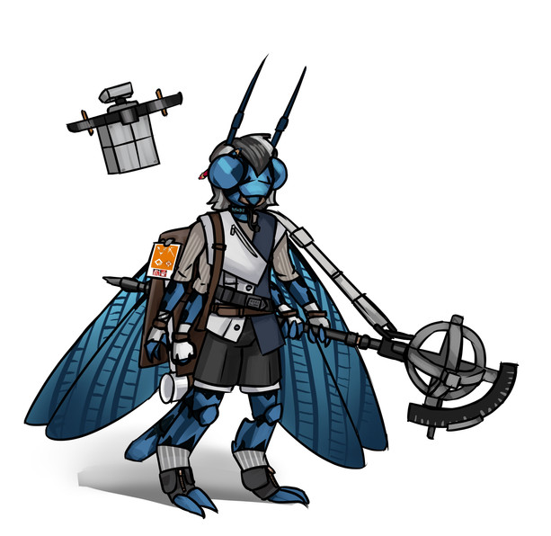 My half of a character design trade with lady-tragedy on FA! It's a steampunk bug with black, purple, and gold colors.They're an aspiring scientist who struggles a lot with technology. They're also very superstitious and have a side hobby in ghost hunting.