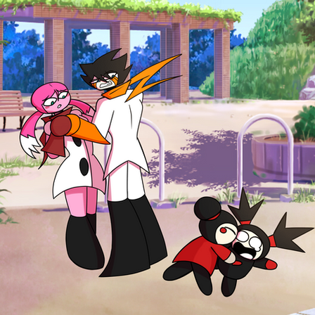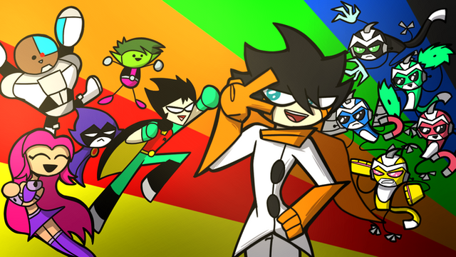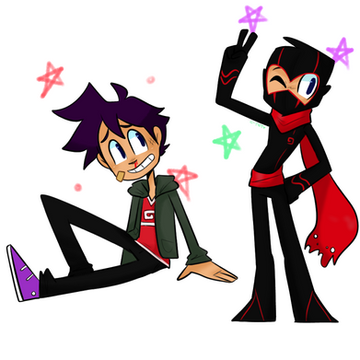 This is artblock at it's peak. I drew freaking Randy cunningham having a duet with Chiro from srmthfg. (SUPER ROBOT MONKEY team HYPERFORCE GO). Although these two characters have scarfs... kinda asain looking, dark spikey hair. And their last episodes of their series is discontinued and ominous. But I like the colors I put out here.Btw remember that One Man One War megaman fanfiction I been working on?