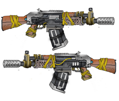 “A descendant of the Euston, this build has a half of its older brother’s magazine size, but makes up for this by firing higher-caliber explosive rounds… in three-round burst. It has less margin for error, but few things can survive a full burst from it completely intact.”