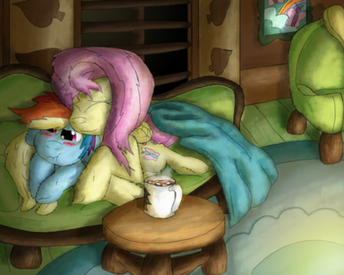 Though she is not an egghead like twilight, studying flight patterns and wing dynamics is an essential part of being a wonderbolt student.T'was a tiring an adventurous day for Rainbow. Tuckered out, she crashes on her desk, and Fluttershy sees to it that she stays warm and cozy~