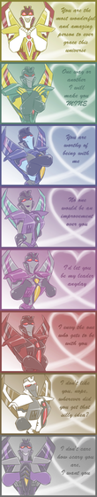 I love screamers here he just likes " you don't do this stuff? oh sucks for you." and skywarp is far too proud not to mention shockwaves crush. XD this whole thing is just so perfect.Β