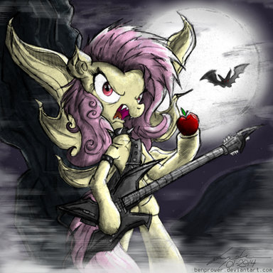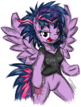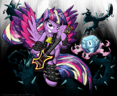 I always love deviations that are based on jokes from the show, and this one is no exception. What I admire most about this piece is the background. It's not just a traditional grey background. There's some actual action going on. I also love that facial expression that you gave to Twilight. It makes her look confident in the uninspired, unimaginative song that she made up on the spot. The only criticism I have a bout this piece is that Twilight's back hooves are a bit too large in comparison to her front hooves. They should match the size and scale. But other than that, I see this as a fairly drawn piece. I love how you managed to enhance an already funny joke with your artwork yet again, and I also love how you're teaching people how they too can play the "Sweep" remix on guitar! All in all, it's a fair piece. Keep up the great work as always, FlutterThrash!