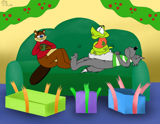 I love this one... all the little details in the back ground gives adds to the holiday setting. You can tell they celebrated in their own special way before snuggling up on the couch. ... so cute...