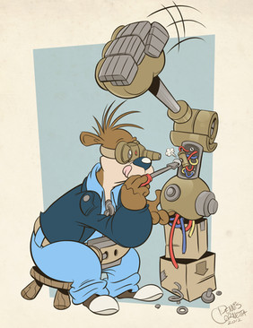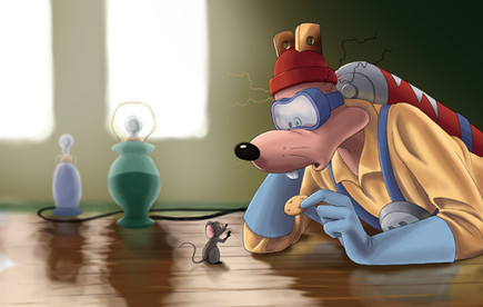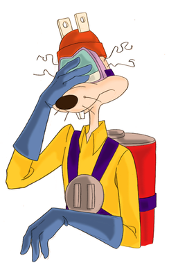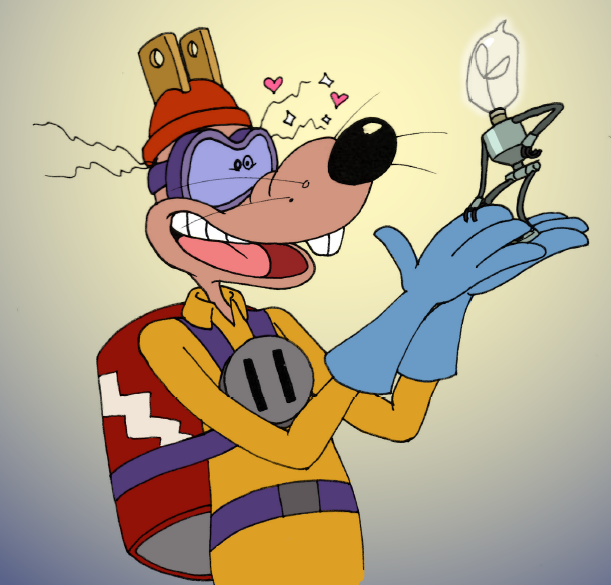 A crane in a slim tuxedo, pinstriped fedora and carrying a cunductor's wand knocks on Megavolt's door: Oi, Megavolt! You available?