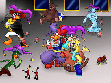Quackerjack spun around in his chair to face the door from which he had just heard the horrific scream of his best friend. As the screaming finally ebbed away completely, he turmed back to Bushroot. The jester's eyes were wide, his big beak open in disbelief and horror.