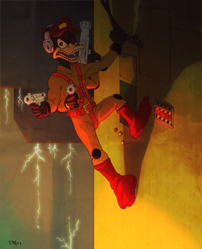 XD ... Hmm. Started out as a sketchbook doodle, was seeing if I could draw him from memory. But I ended up forgetting about his battery and chest outlet thingy. I was gonna add them, but then I noticed he looked scared. Well ofcorse! He's powerless without his battery... I think? So I left them out. Then I thought, hmmm... what is he cowering from? Darkwing? Naaah. Too obvious. OH. TENTACLES. Yes.