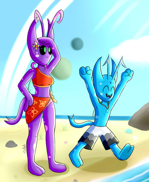 Dinko and Mimi. Playing ball. All alone. On the beach. At night. Why? Because I wanted to draw glowy things, okay.Mimi belongs to