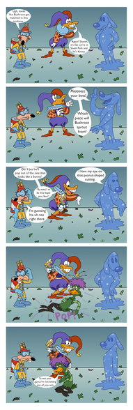 2: She did the lovely Bushy/Liqui lovins and the background. I drew the jealous QJ. She says he's saying "Why don'tcha ever show me love like THAT anymore?" to Megavolt who is... off screen.