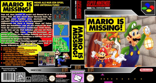 RCC clean cover for Mario is Missing! (SNSP P MU) by Mindscape Inc..Those covers were created via GIMP and are meant to be used with Retro Cartridge Cases (www.startnext.com/rcc ). When the RCC are available, all covers will be released to the public.