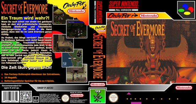RCC alternative cover for Secret of Evermore (SNSP P AEO*) by Nintendo.Those covers were created via GIMP and are meant to be used with Retro Cartridge Cases (www.startnext.com/rcc ). When the RCC are available, all covers will be released to the public.