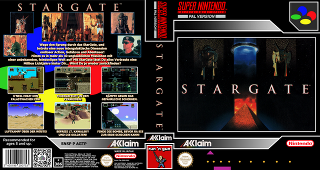 RCC base cover for Stargate (SNSP P AGTP) by Acclaim.Those covers were created via GIMP and are meant to be used with Retro Cartridge Cases (www.startnext.com/rcc ). When the RCC are available, all covers will be released to the public.