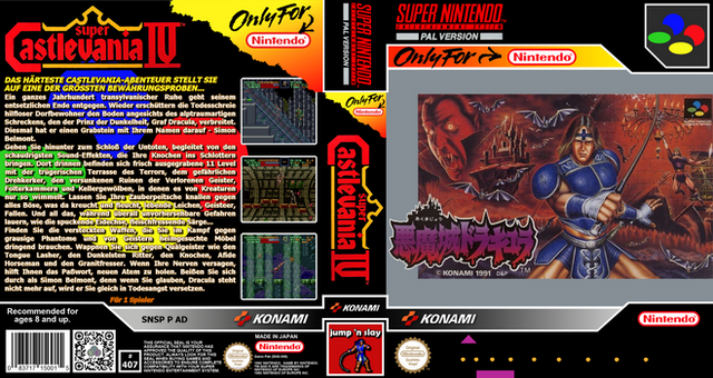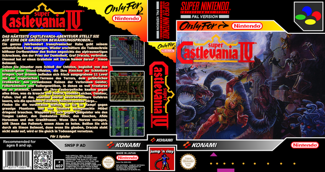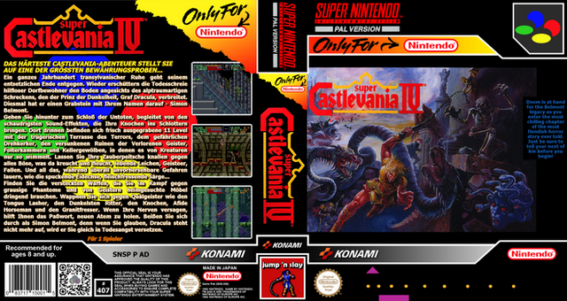 RCC base cover for Super Castlevania IV (SNSP P AD) by Konami.Those covers were created via GIMP and are meant to be used with Retro Cartridge Cases (www.startnext.com/rcc ). When the RCC are available, all covers will be released to the public.
