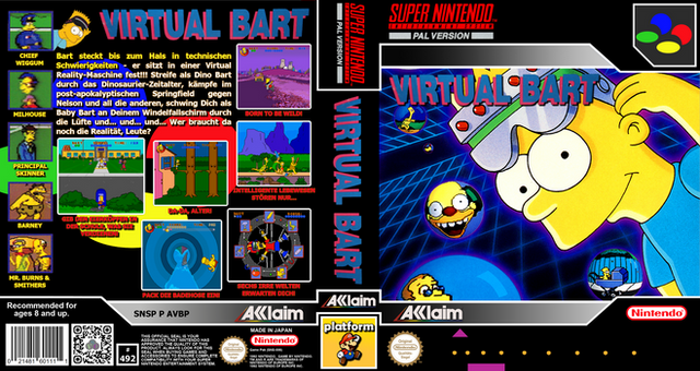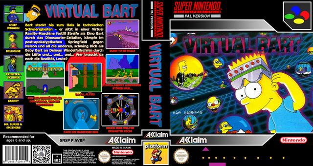 RCC clean cover for Virtual Bart (SNSP P AVBP) by Acclaim.Those covers were created via GIMP and are meant to be used with Retro Cartridge Cases (www.startnext.com/rcc ). When the RCC are available, all covers will be released to the public.