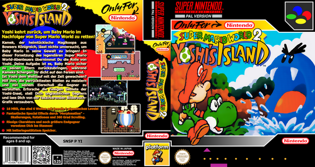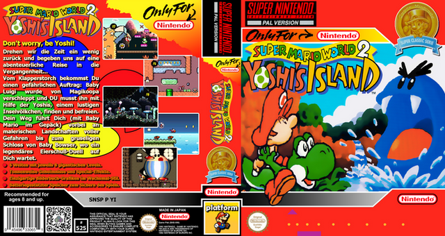 RCC SCS clean cover for Yoshi's Island [Super Mario World 2:] (SNSP P YI) by Nintendo.Those covers were created via GIMP and are meant to be used with Retro Cartridge Cases (www.startnext.com/rcc ). When the RCC are available, all covers will be released to the public.