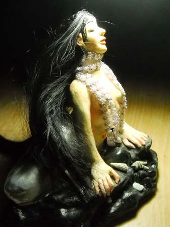 A Banshee, combing her pale hair with a silver comb. It is said one should not pick up a silver comb if one finds one lying on the ground -- it might be a lure from the Banshee. This one would stand around 8 inches tall. In Kato Polyclay and washi paper.Related content