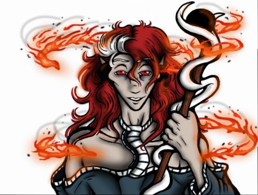 I love how the light reflects on to his face and chest, though more attention to detail could help with really providing definition to the rest of his features. Dramatic lighting can skillfully be used to enhance more prevalent features and give a character a more "real" look. While the lighting was aptly used, there was a lack of shadowing in the deeper parts of the work. While it was still present, I feel that it could have been dramatized to enhance the whole of the painting. I'd like to compliment the flow of the fire from his palm, as it seems to entwine the rest of the piece and pull everything together. It was a truly beautiful part that is also stunning to look at.