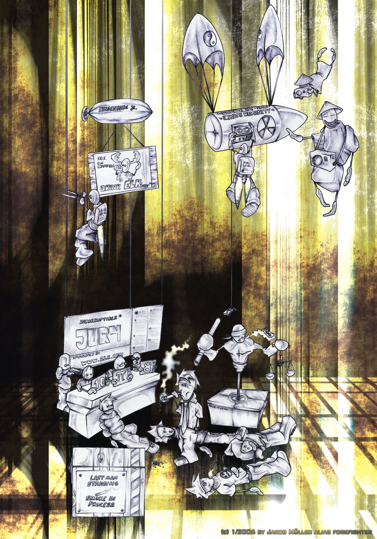 Ich weiß nicht, im Entstehungsprozess dieses Bildes ist mir einfach ein ganzer Haufen Dinge eingefallen, die sich wunderbar in den Kontext fügen. Meine Basisidee waren einfach diese paar Raucher unten im Bild. Selbst die Jury und die Hommage an Justizia sind mir erst später gekommen, ganz zu schweigen von den ganzen Leuten, die oben durchs Bild fliegen. Blöderweise ist mir bei den japanischen Touristen erst später eingefallen, dass man die in Kombination mit der Atombombe möglicherweise in einen heiklen politischen Kontext bringen könnte (Hiroshima). Aber wenn man immer nur kuckt, wen man wo wie verletzen oder "beleidigen" könnte, kommt gar kein Bild zustande. Also hab ich sie drin gelassen und kurz nen Kommentar in der Bildbeschreibung verfasst.