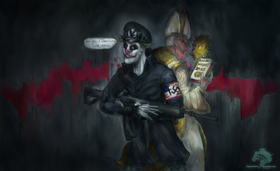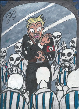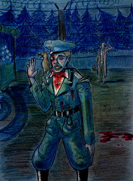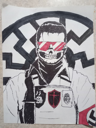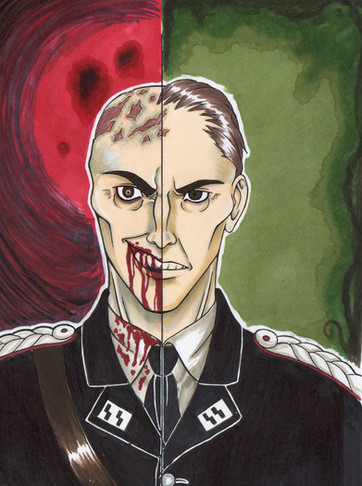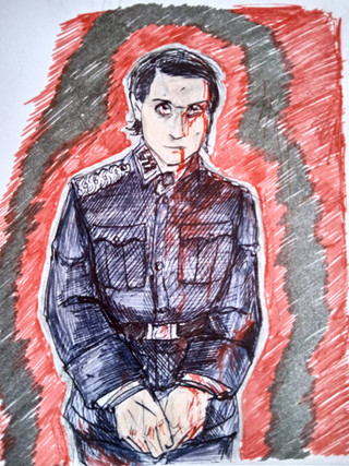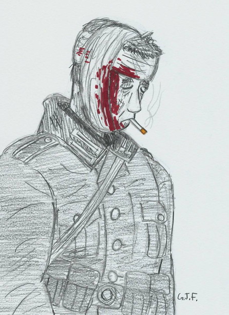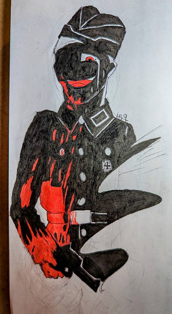 A mixture of digital and traditional drawing.Hans is delighted, but the others don't. Both aren't comfortable because they aren't wearing the uniform.