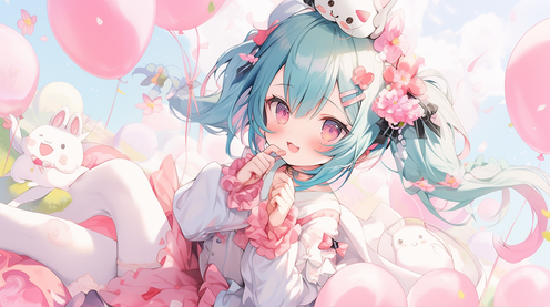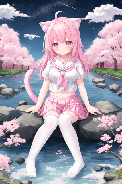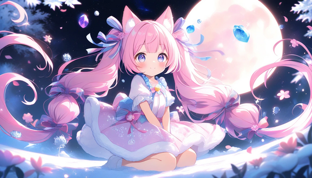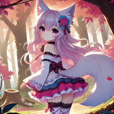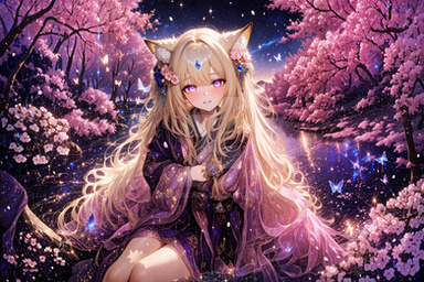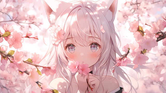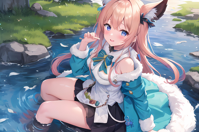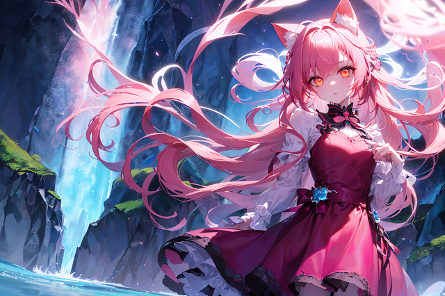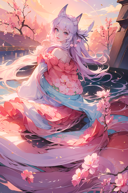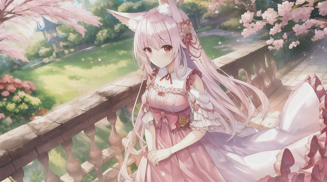 #beautiful #blue #detailed #dress #ears #eyes #fantasy #fox #garden #girl #hair #jewels #lake #long #pink #sakura #water #white