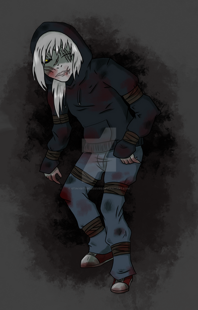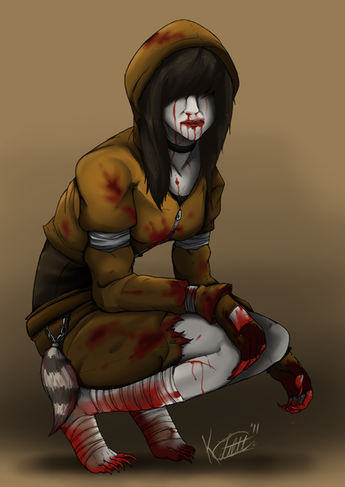 Description:Her left hand is covered in bandages due to a molotov mishap pre-infection, Moose tried setting a tank on fire but part of the flame brushed her sleeve causing her hand to burn. Both of her eyes are gauge out. She has a bite on her left lower leg when she attempted saving her sister, Kali, from a man who was infected. They later took refuge in their childhood tree house, when Kali asked Moose to bite her as well.