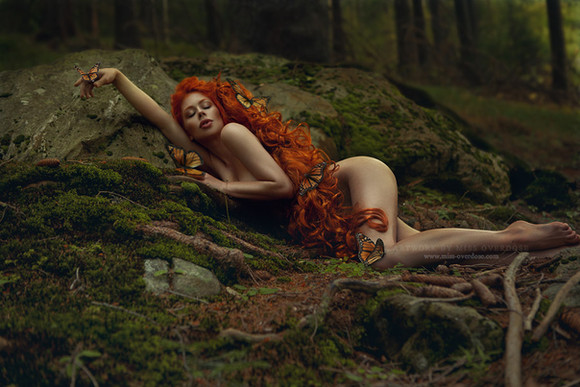 Wow, this is incredible. Firstly, love the setting and that light blur on the trees in the background and the colours are terrific with her red cloak and hair standing out so well amongst the trees. The model herself is sensational, so very beautiful and posing her body in such an alluring way with the slant of her shoulders and hips, body bending between them, the curves of her hips accentuated by the crossing of her thighs and the flow of her legs towards the ground. The light and shadows perfectly define her too, highlighting her pale skin as it does so, I particularly like how she directs her face towards the light, the way that her arms are bathed in light from above with shadows embracing them from below with a similar effect with her breasts and stomach as well as her left leg.
