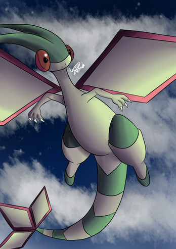 That flygon is quite intimidating, and the geometry of the piece appears to be like looking at clouds and a sky from inside a cylinder. Such focus really brings my eyes to his with the direction that the clouds lean me. Also, the shading style is pleasing to me.