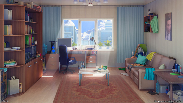 I love your backgrounds! The wallpaper on the monitors is a nice touch, very realistic. I adore your textures (look at those rugs!!).