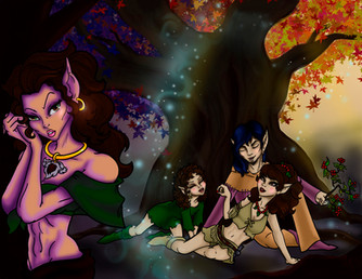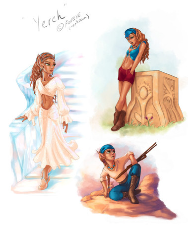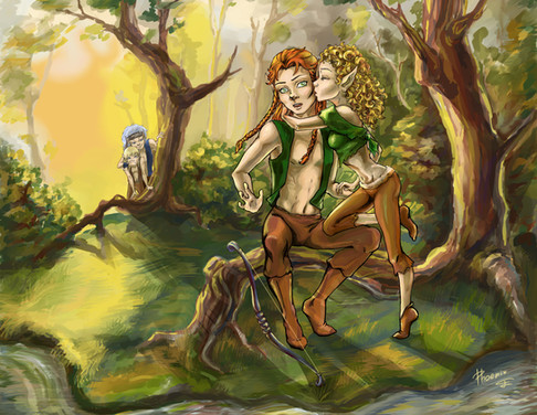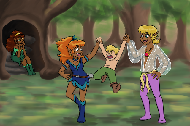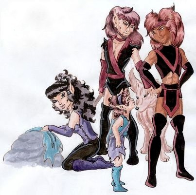 Crescent (the brunette) died very young. Many millenia later her parents had a second daughter Chitter, an elf child direly in need of horse tranquilizers. She's still a toddler at the time I drew this. It made me sad that the two sisters would never meet.So, as fans are likely to do, I drew one huge honking 'What if?'. What if Crescent were alive? And I extrapolated what her hyper kid sister would be like a bit older. And stuck 'em together.