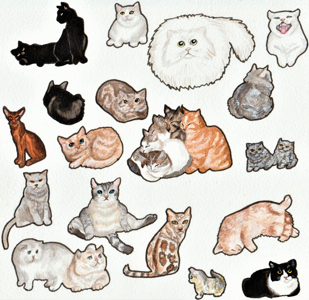 Catching up on posting more art from last year.Domestic cats, from top to bottom: Munchkin, Japanese Bobtail, Siamese, Abyssinian, Persian, Burmese, Russian Blue, American Shorthair, Ragdoll, and Maine Coon.