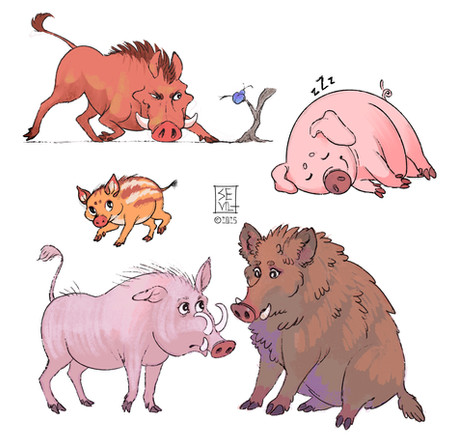 i love the expressions you give all of your animals in this! the bearded pigs and red river hogs are some of my favourite animals (they have such awesome facial hair, wizard pigs!) and this is a great picture showing the diversity of pigs.