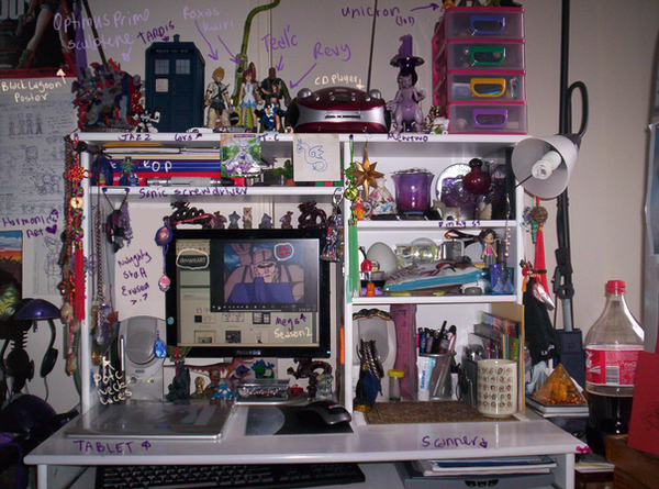 This is my computer area. everything here is essential to working on my art. Everything from the Scanner, to the pack of Smack Ramen.Related content