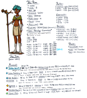 Disadvantages: Tesselae is a water creature, not just a water-user, so he's vulnerable to Forest magic. He relies on water to fuel his magic but also to keep him alive; he suffers greatly if he is dehydrated. Speaking of magic, his techniques do poor amounts of damage compared to other schools of magic, so he has trouble closing a fight quickly unless he has an unfair advantage.